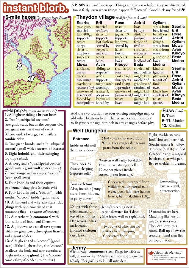 un donjon, une grille de relations, une table de monstres aléatoires, qui tient en une page (NdT)