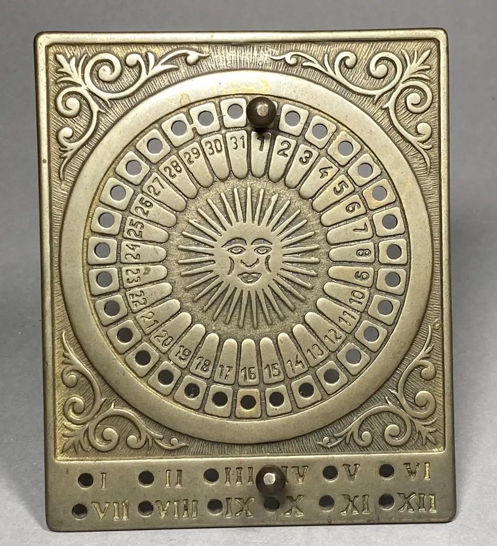 Calendrier perpétuel – 25 € - on en trouve d’autres sur Etsy / eBay, mais assurez-vous bien que les deux chevilles sont présentes ! Elles manquent souvent pour les offres les moins chères