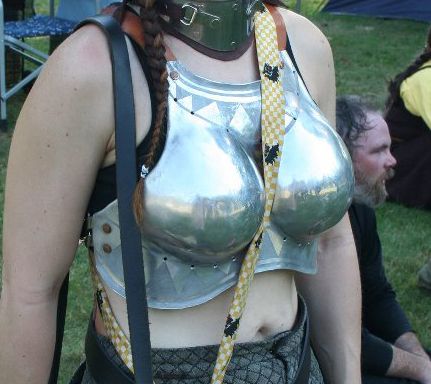 Ça, c’est un plastron pour poitrine. Je l’ai fabriqué. La femme sur la photo a demandé qu’il soit ainsi. Elle se bat avec et je crains en permanence qu’elle tombe violemment et que le plastron lui brise le sternum, malgré le rembourrage. Notez aussi que ce plastron semble parfaitement conçu pour guider les pointes d’épées et les flèches vers son cœur. Elles doivent encore traverser l’armure, mais sincèrement, c’est un défaut de conception [et en plus elle ne protège pas le ventre ni le bas ventre ! Regardez l'armure de Jeanne d'Arc ; la cotte descend jusqu'en haut des cuisses ! (NdT)]. Cependant, l’armure rend bien et la fait se sentir à la fois sexy et balèze. C’est tout aussi important.