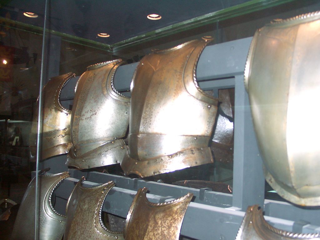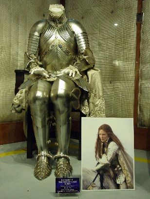 Comme l’indique la pancarte, cette armure provient du film Elizabeth : L’Âge d’or. Elle est superbe. Modelée sur une armure de plates germanique de type gothique, je n’ai qu’une réserve à son sujet : pas de protection du cou. C’est important, mais regardons plutôt ce qu’ils ont bien fait.