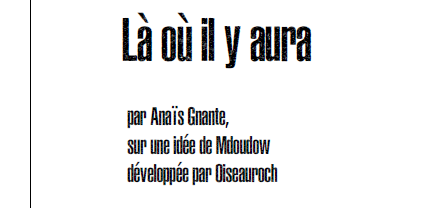 Le jeu, entre-temps renommé Là où il y aura, a terminé 7e sur 13. J’ai l’impression d’avoir condamné mes coauteurs avec mon concept maladroit et trop large. Ils ont été trop fidèles à l’univers et aux règles. Le jeu aurait dû être un storygame avec création commune de l’univers,... mais je ne suis pas doué en storygames.
