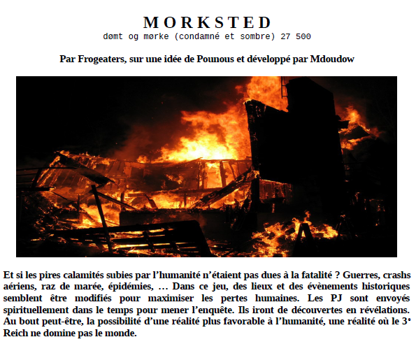 La position d’auteur de l’étape 2 est la moins facile, dans la mesure où on est tenu par ce qu’a écrit le premier auteur, et où ce qu’on va faire va être chamboulé par le troisième. Quand j’ai reçu Morksted avec ses voyages dans le temps et ses lieux maudits, j’en menais pas large car je n’aime pas le fantastique. Puis j’ai réfléchi une semaine, attendant l’inspiration, surtout que Pounous [l’auteur de la 1re étape (NdlR)] n’explique pas la cause du Morksted – le lieu maudit. J’ai fini par proposer plusieurs explications entre lesquelles le MJ choisit celle qu’il préfère, et qui va déterminer le style de son jeu et de sa campagne.
